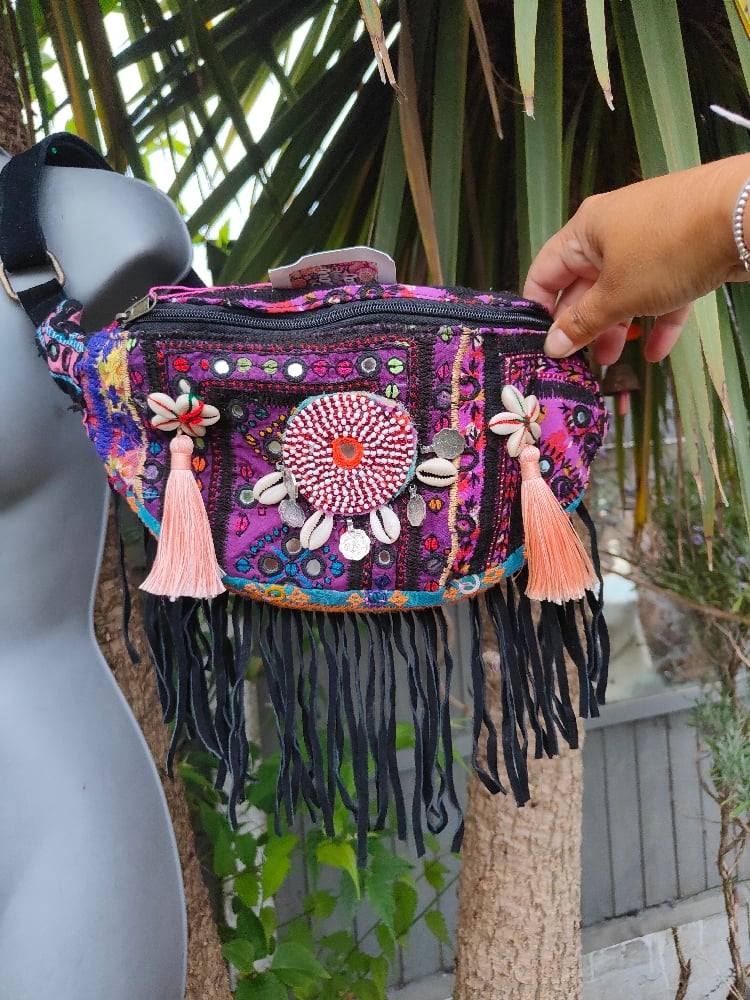 Boho bum bag with fringes in leather wear as a cross body bag -you have to step into the strap