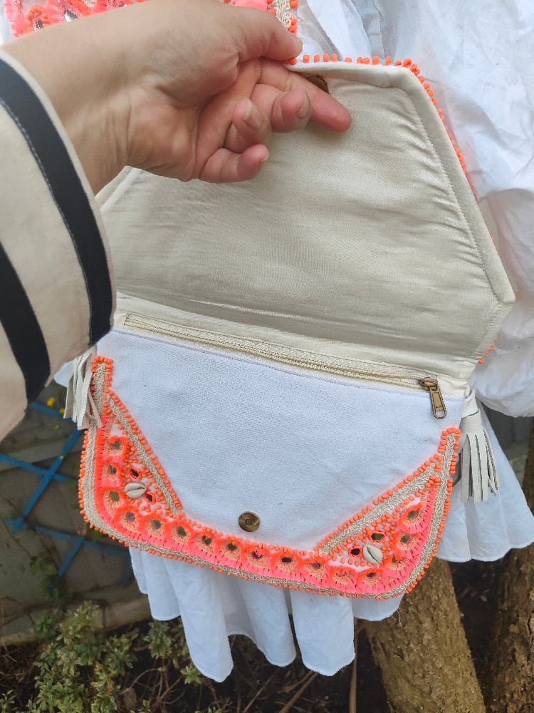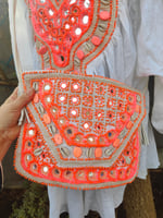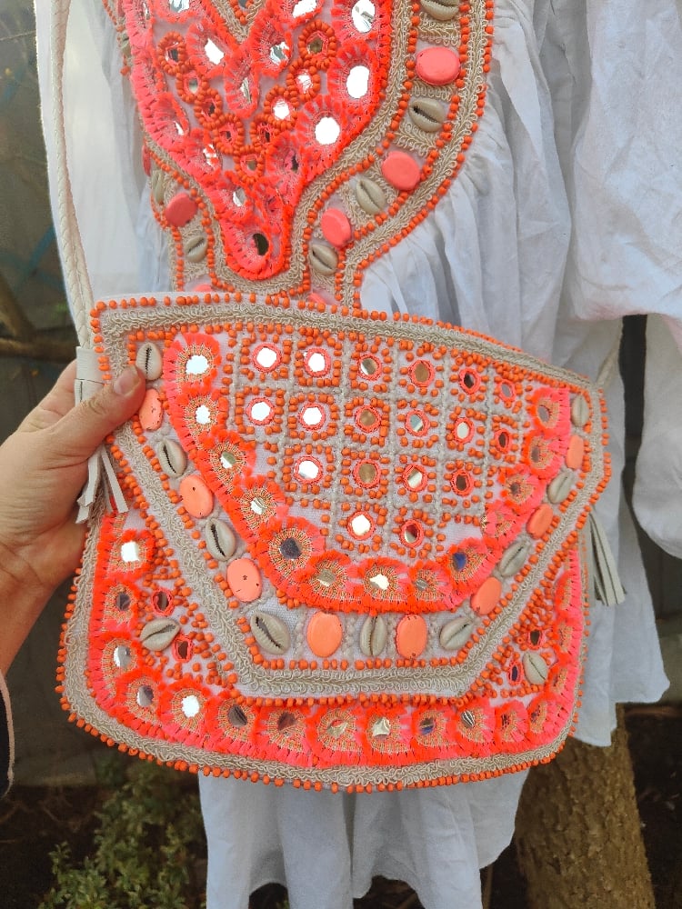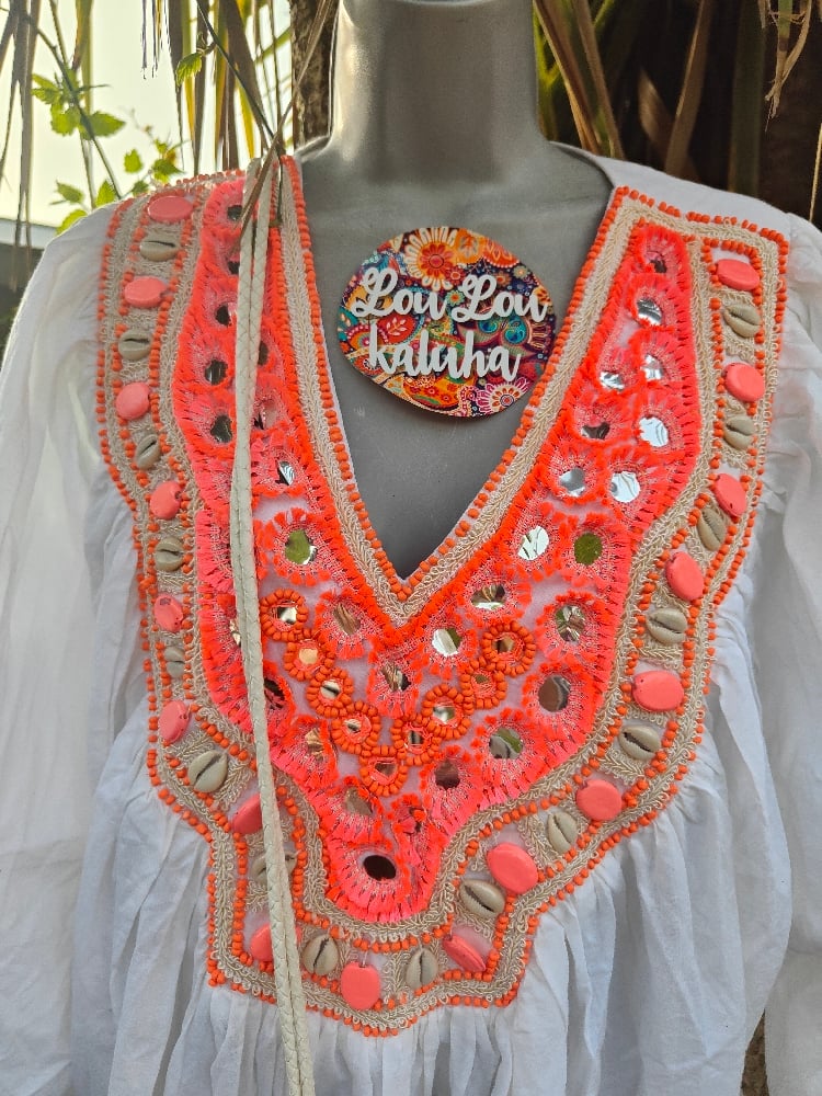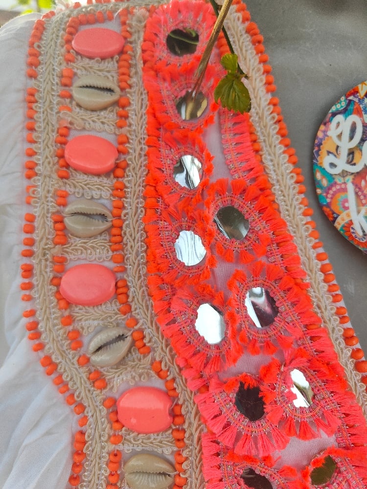 Heavily embellished with neon coral details, shells, stones embroidery etc