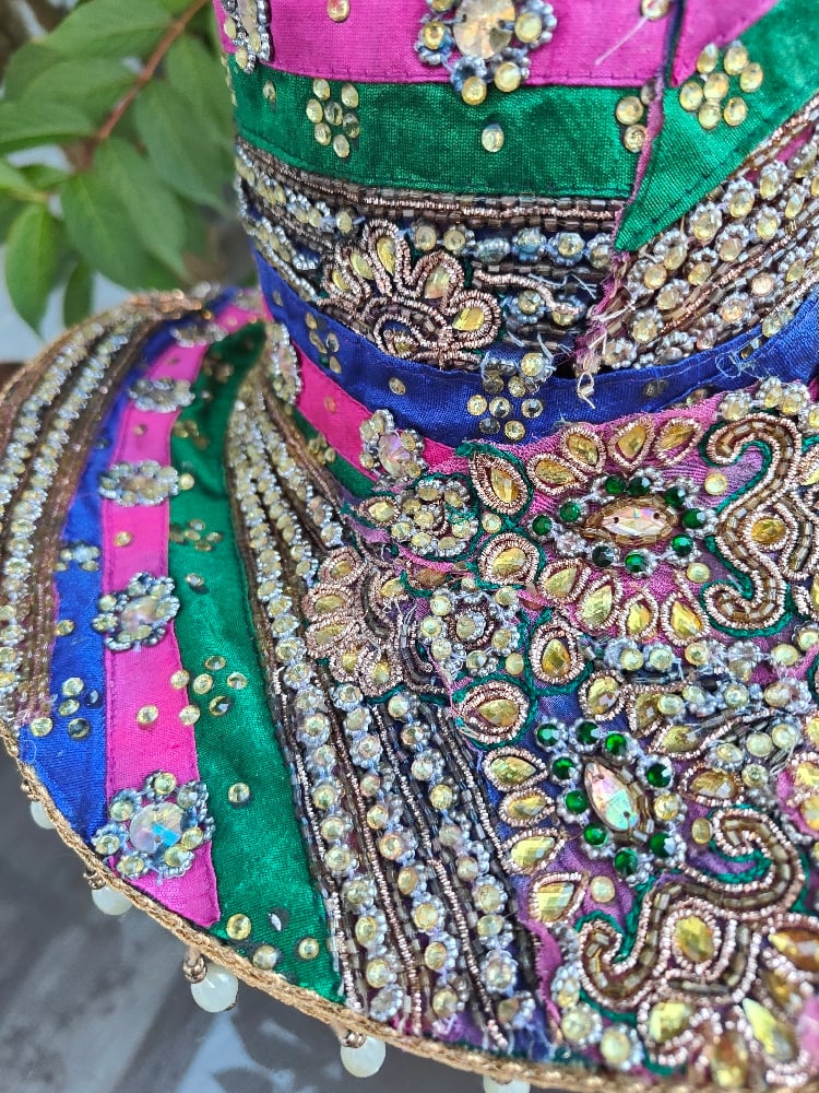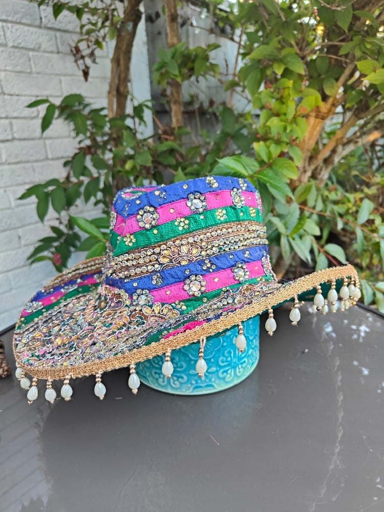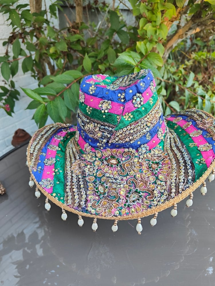 Dolly cowboy hat - recycled sari fabric green pink blue