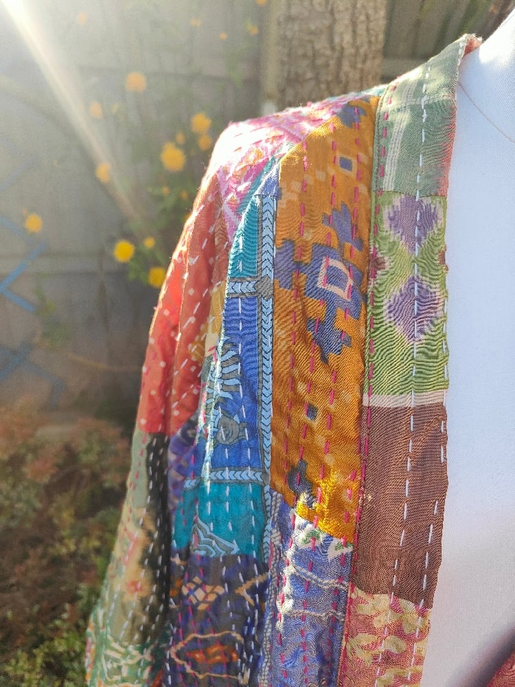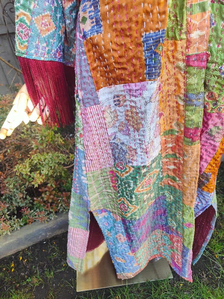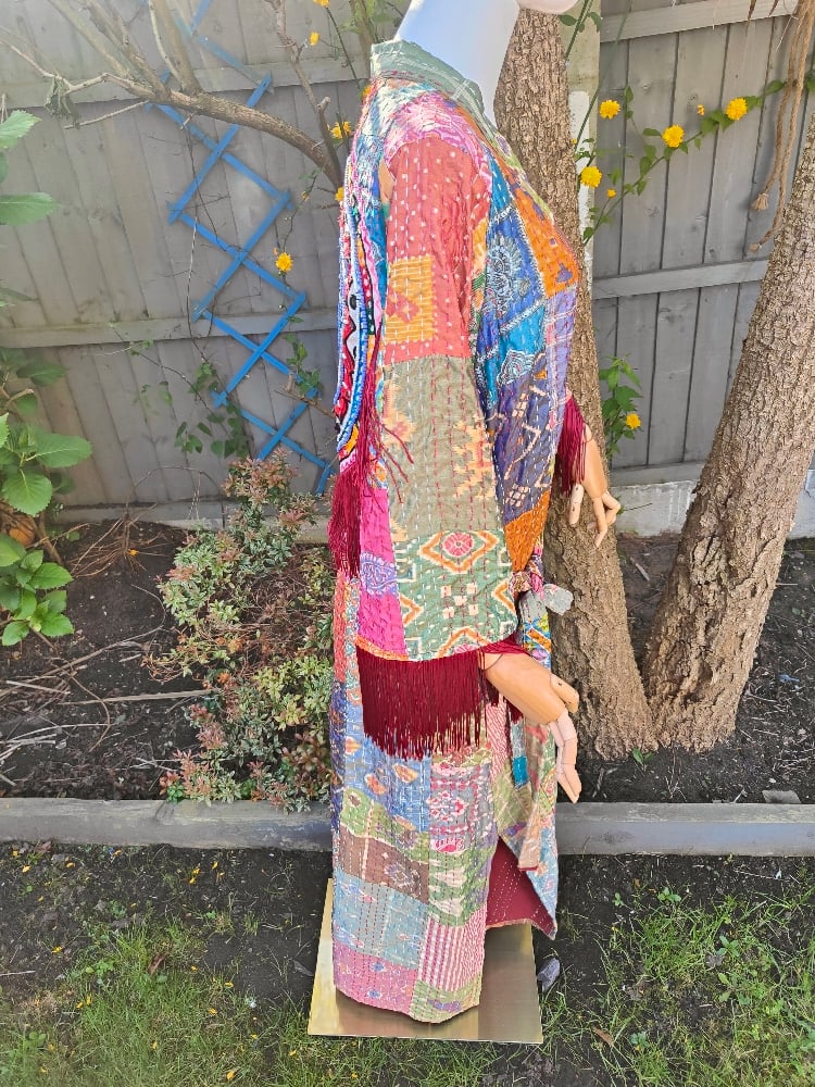 Fiesta kaftan made with kantha quilt fabric needlework and fringed on sleeves and back.