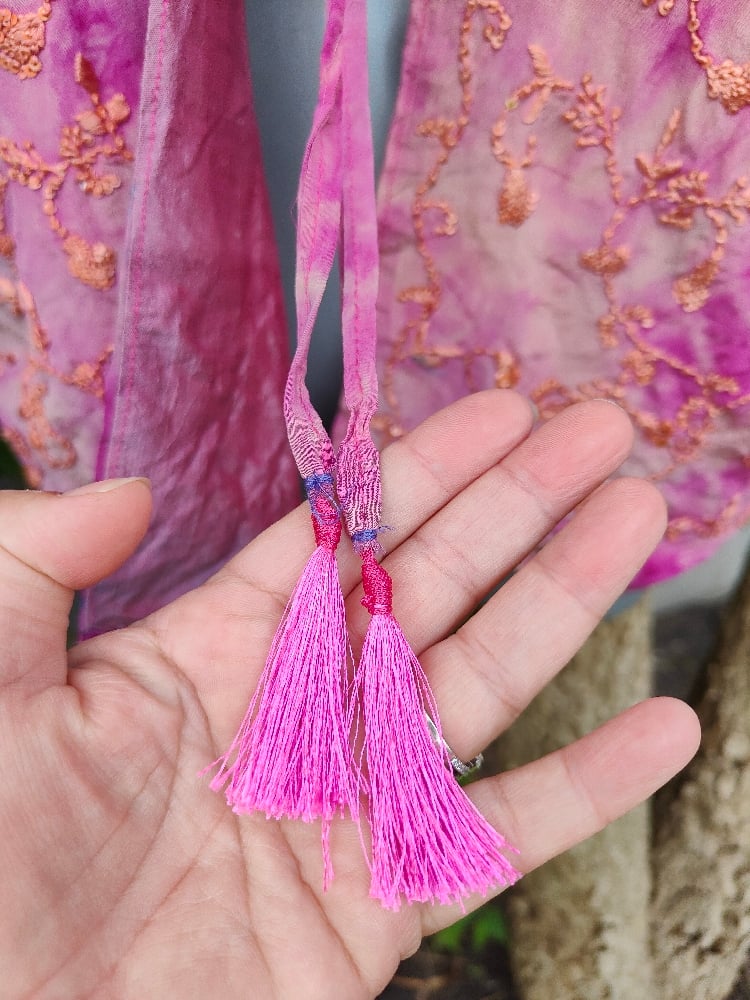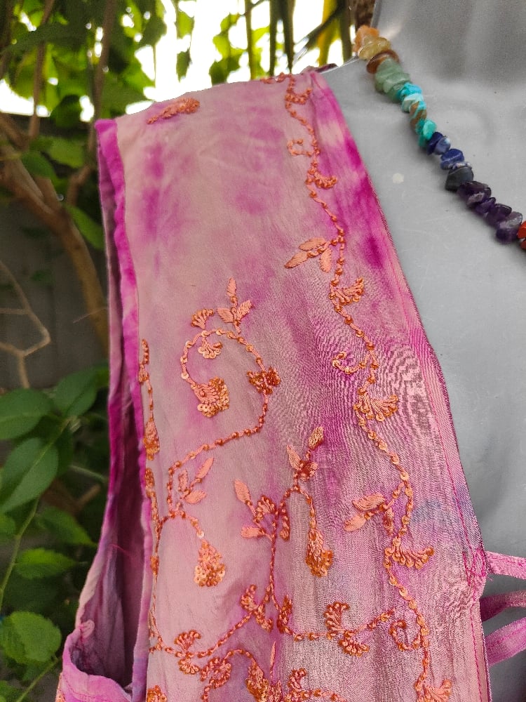 Made from recycled tie dye sari fabric, often wedding saris with the jewels in.......vintage recycled so not in new condition!