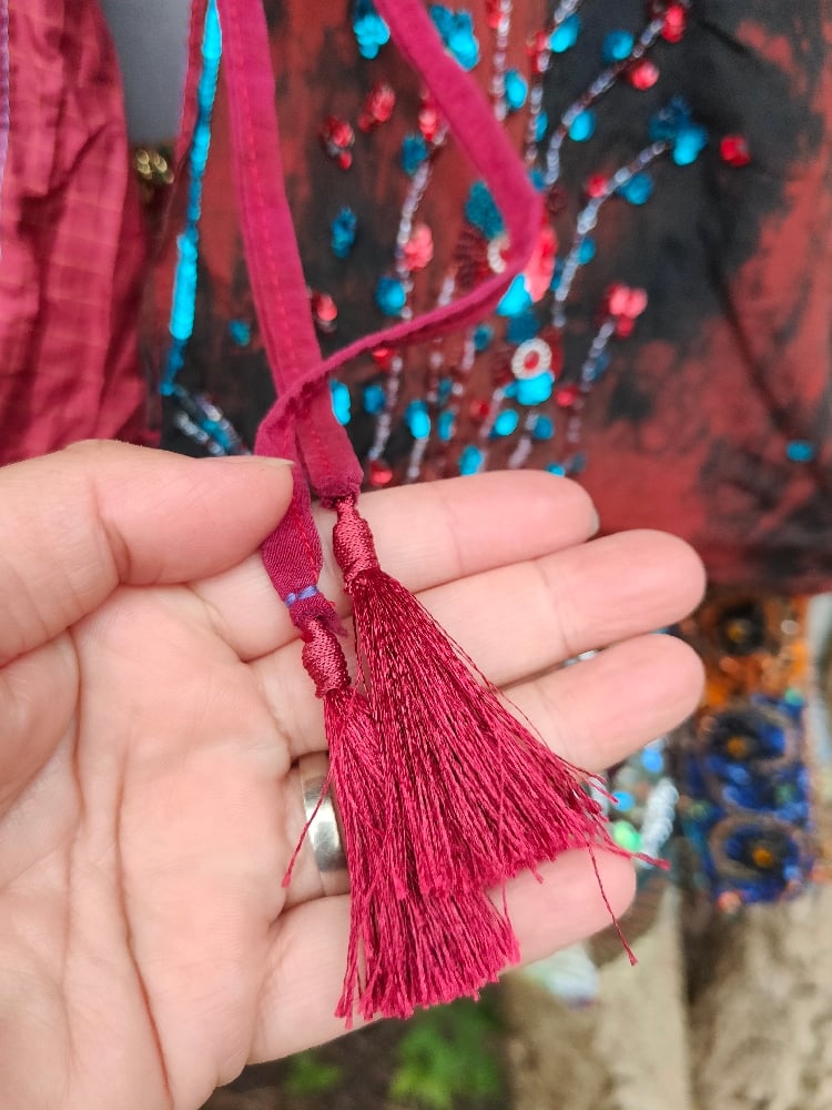 Made from recycled tie dye sari fabric, often wedding saris with the jewels in.......vintage recycled so not in new condition!
