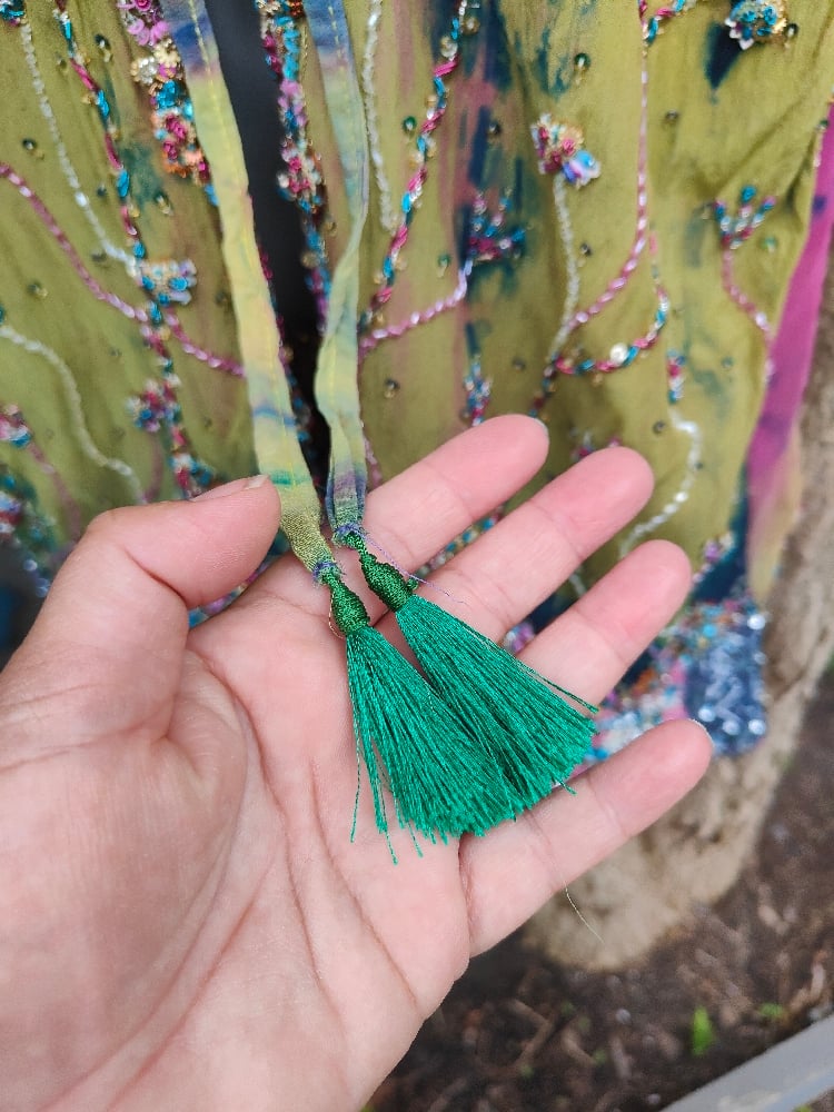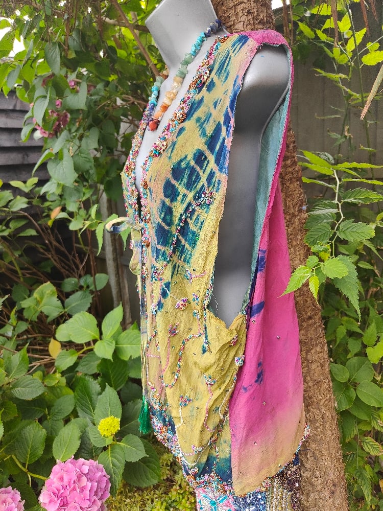 Made from recycled tie dye sari fabric, often wedding saris with the jewels in.......vintage recycled so not in new condition!