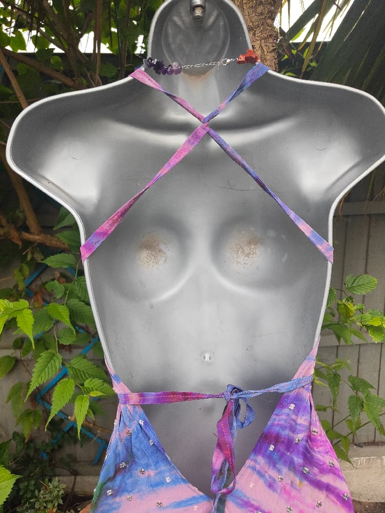 Measures 55 inches from top of halter top but then the ties or very long so can make shorter or longer