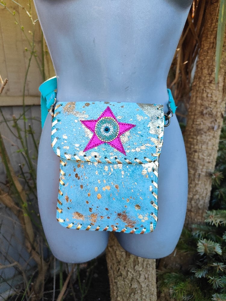 Woodstock cross body / passport bag -Jade turquoise with pink star